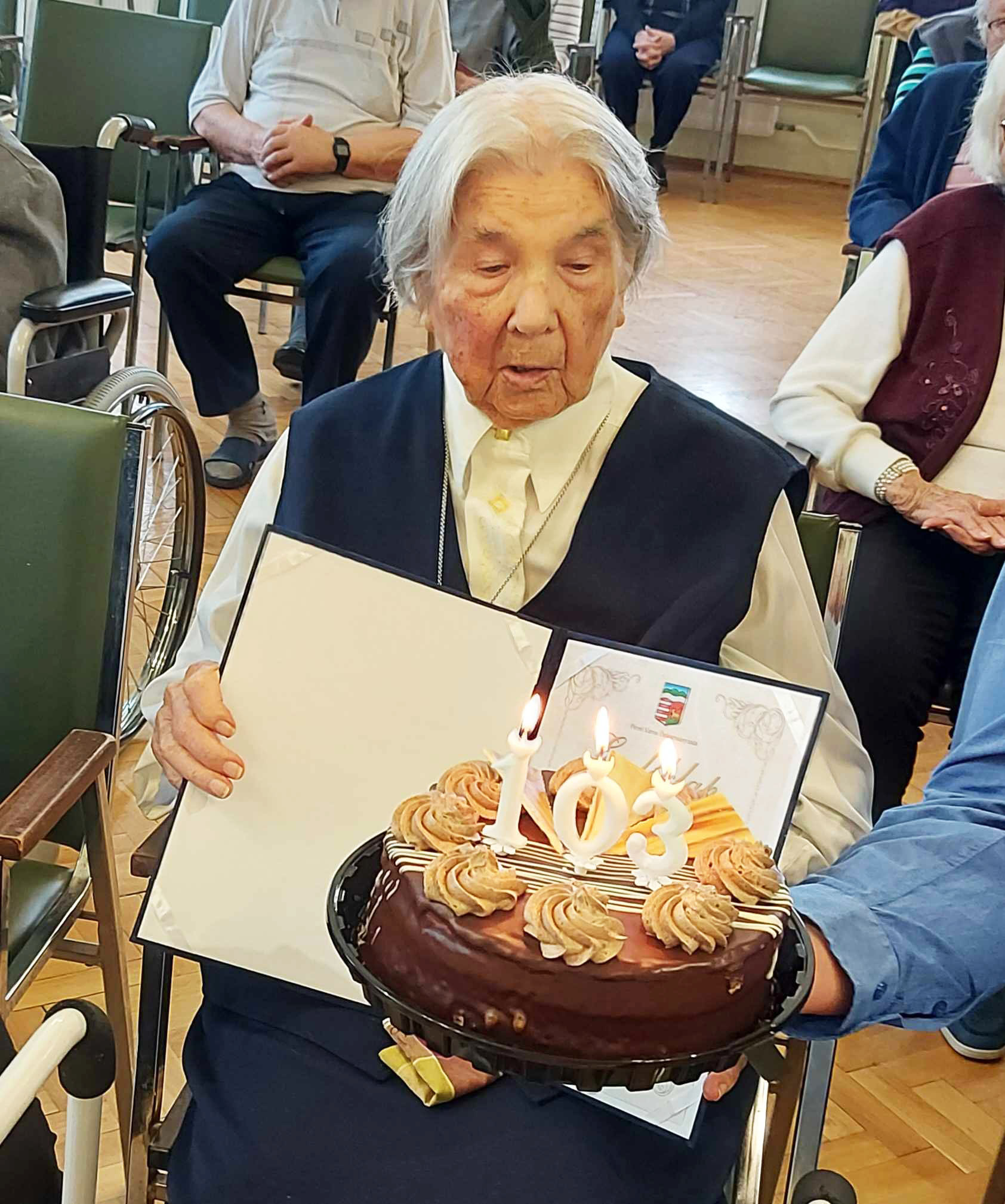 Maróti Margit nővért 103. születésnapja alkalmából Horváth Tibor polgármester és Sarlós Imre alpolgármester köszöntötte a Jézus Szíve Társasága Idősek Otthonában.