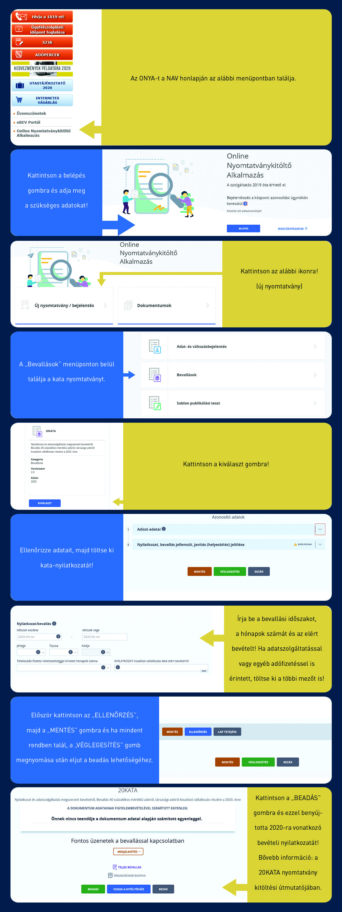 A katásoknak február 25-éig kell elküldeniük a 20KATA nyomtatványt a Nemzeti Adó- és Vámhivatalhoz (NAV). A bevételi nyilatkozat tavaly óta az Online Nyomtatványkitöltő Alkalmazással (ONYA) is elkészíthető, így egyszerűbb és gyorsabb a kitöltés, sőt még külön program sem kell hozzá.
