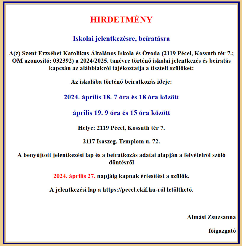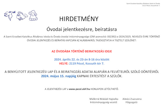 Kezdőlap Hírek Oktatás A Szent Erzsébet Katolikus Általános Iskola és Óvoda beiratkozásával kapcsolatos tájékoztatói 2024 április 11. A Szent Erzsébet Katolikus Általános Iskola és Óvoda beiratkozásával kapcsolatos tájékoztatói