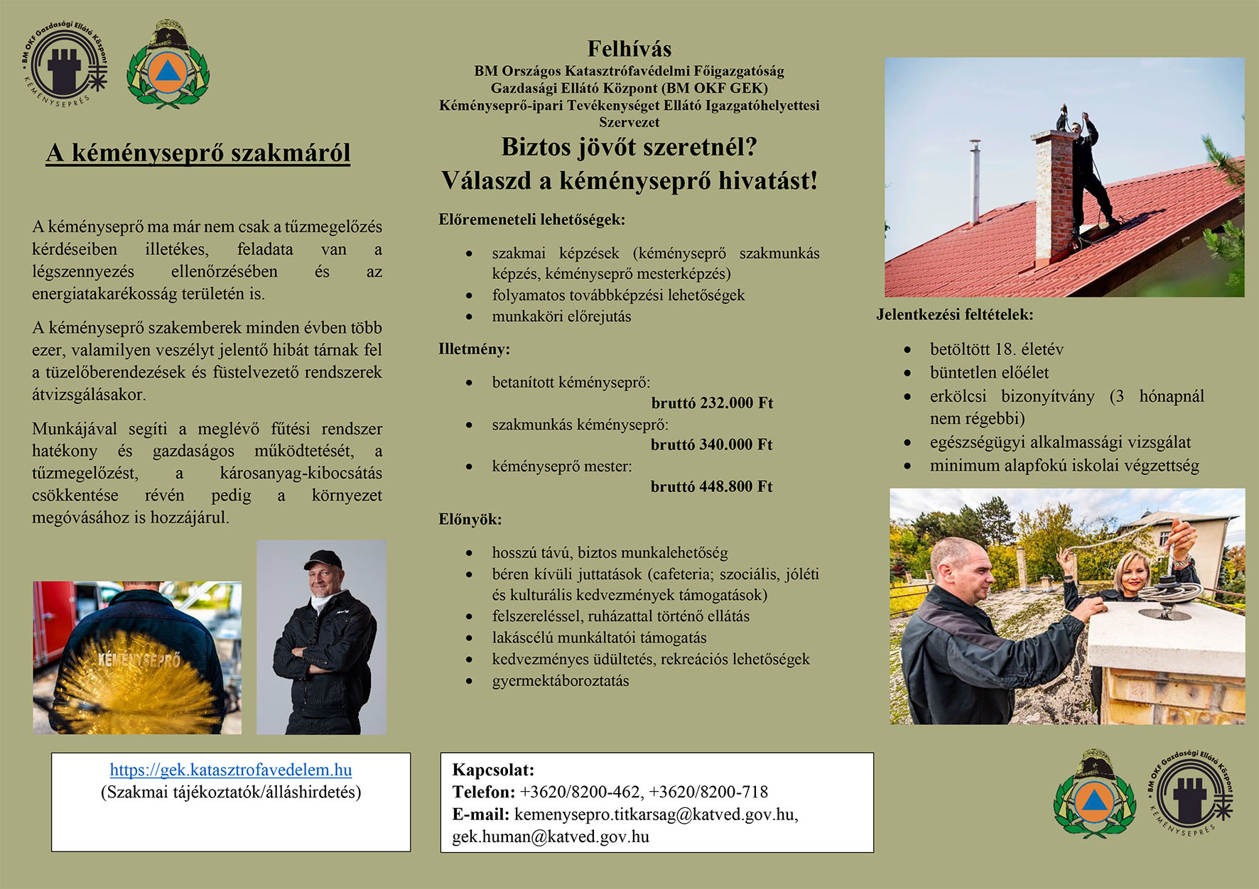 BM Országos Katasztrófavédelmi Főigazgatóság Gazdasági Ellátó Központ (BM OKF GEK) Kéményseprő-ipari Tevékenységet Ellátó Igazgatóhelyettesi Szervezet kéményseprő szakmunkásokat és betanított munkásokat keres