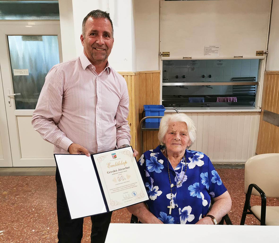 A mai napon Greskó Józsefnét 90. születésnapja alkalmából Horváth Tibor polgármester köszöntötte a Jézus Szíve Társasága Idősek Otthonában.
