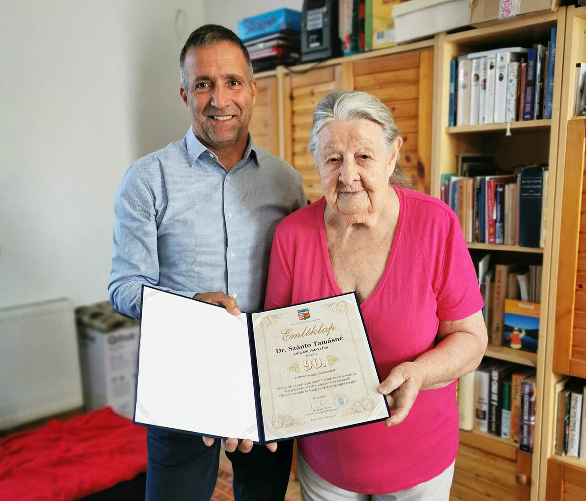 Dr. Szánto Tamásnét 90. születésnapja alkalmából Horváth Tibor polgármester otthonában köszöntötte. Éva néni meghatódva fogadta a gratulációt, az okleveleket, a virágot és a tortát.