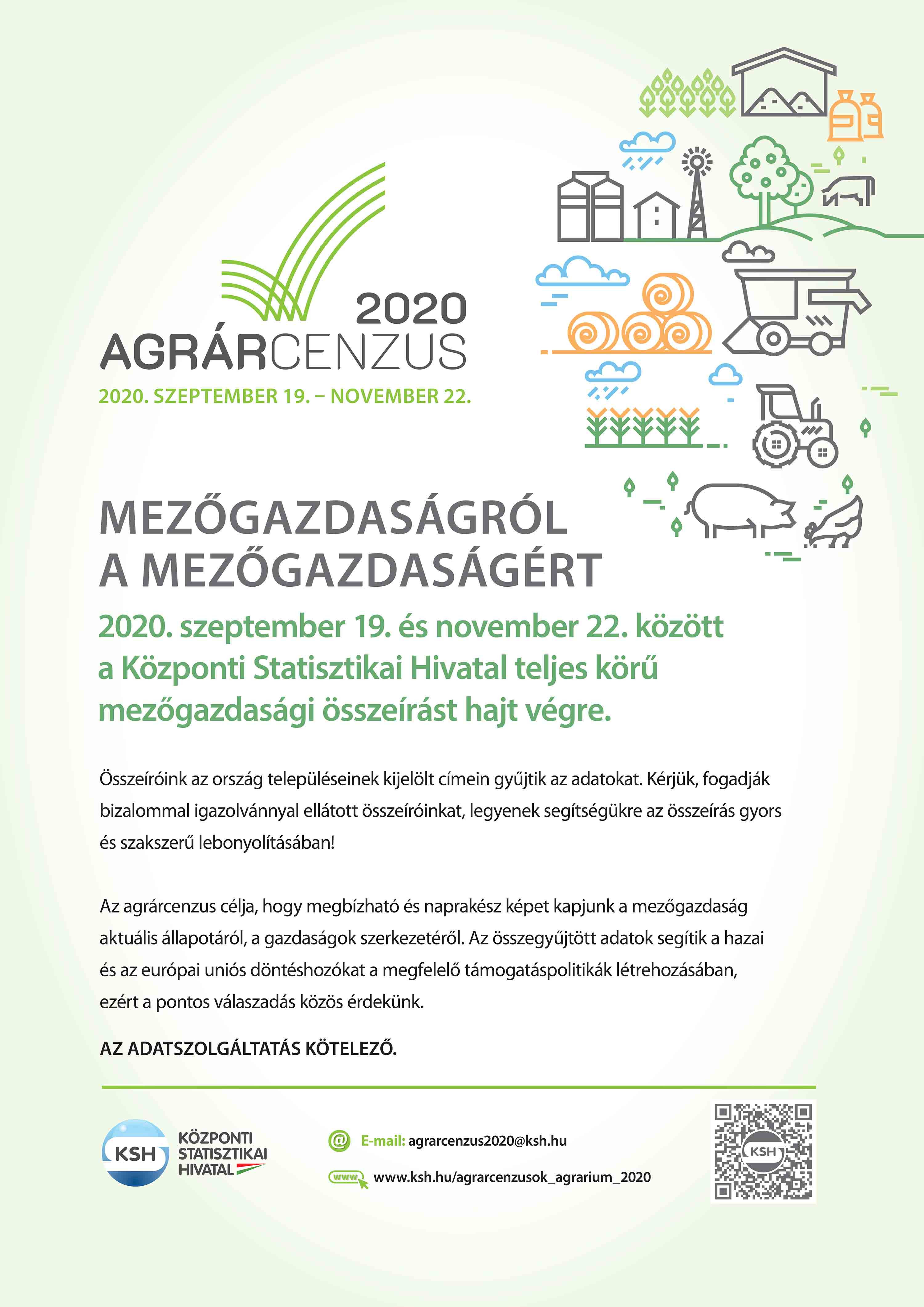 További információ az Agrárcenzus 2020 mezőgazdasági összeírásról a következő linken érhető el: www.ksh.hu/agrarcenzusok_agrarium_2020