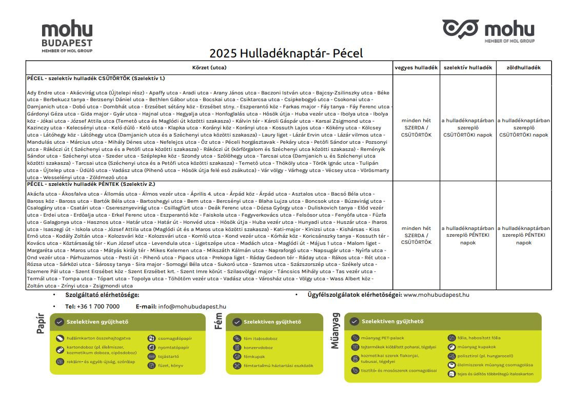 A MOHU Budapest Zrt. a hulladéknaptárat és a féléves gyűjtési napokat tartalmazó frissített tájékoztatót küldött meg Pécel Város Önkormányzata részére, amelyből kiderült, hogy változás kizárólag a szelektív hulladék elszállításának rendjét érinti.