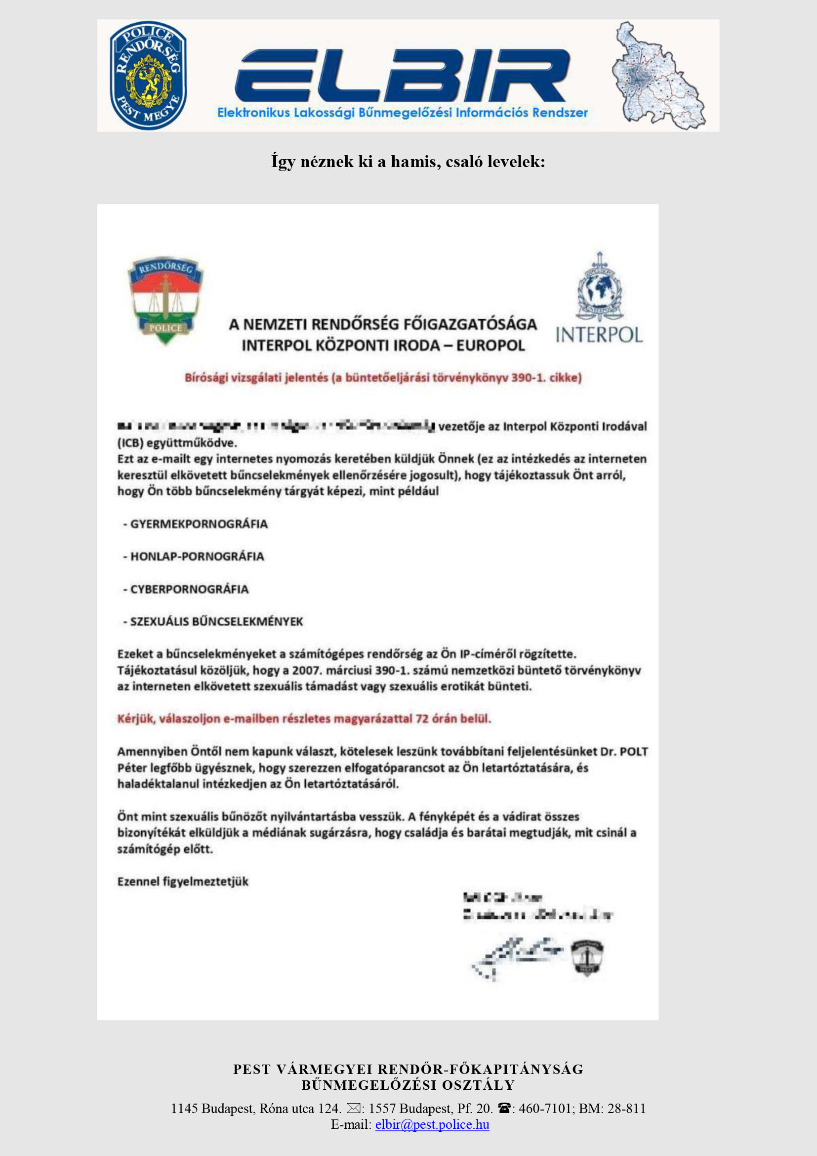 Valótlan tartalmú levelek terjednek az interneten, amelynek aláírójaként rendőri vezetőt jelölnek meg. Legyen körültekintő az érkező e-mailekkel és ne adjon esélyt a csalóknak! Ha a rendőrség vagy az Interpol nevében kap gyanús levelet, hagyja figyelmen kívül!