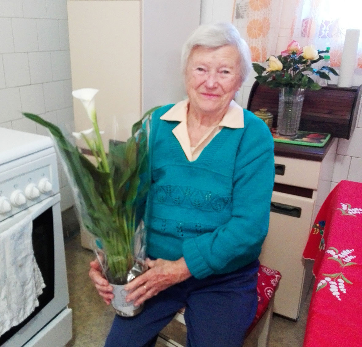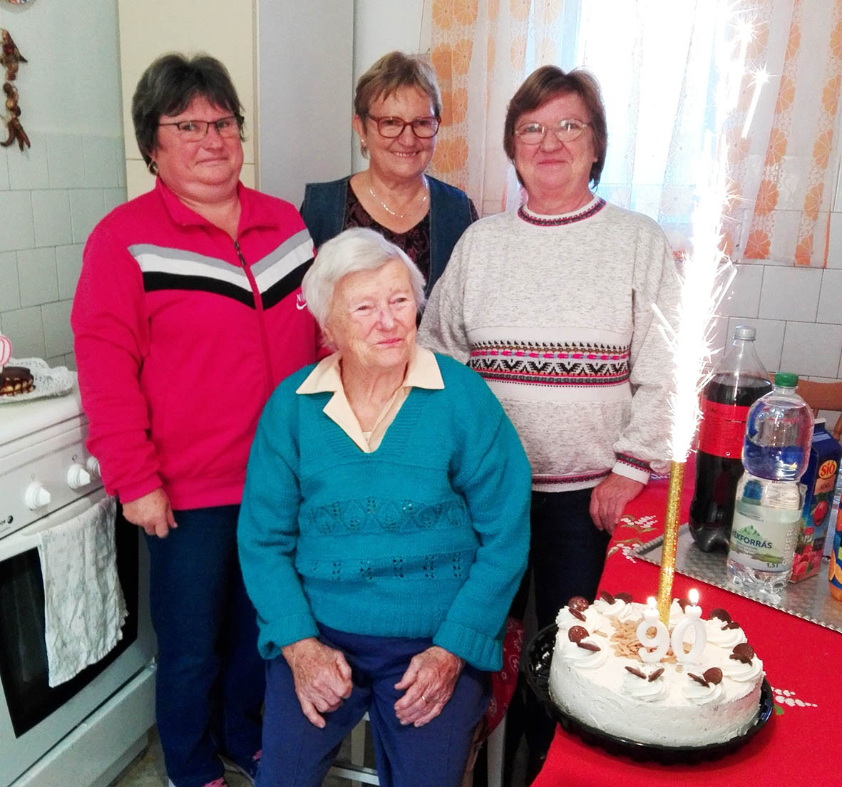 Magdi néni nagy örömmel fogadta a köszöntő szavakat, a tortát, a virágot és az okleveleket.