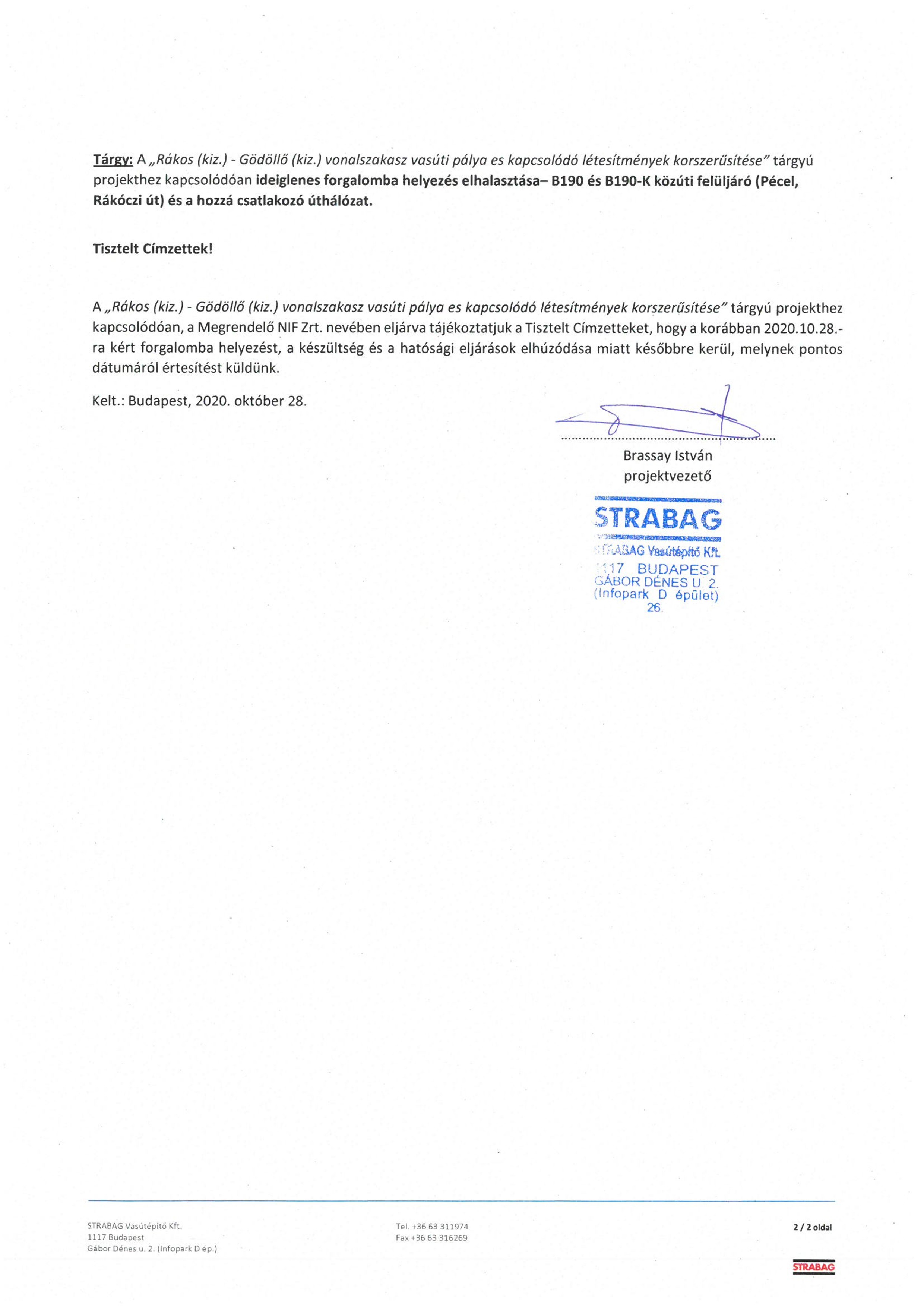 A Strabag Vasútépítő Kft. tájékoztatja a lakosságot, hogy a Pesti út és Rákóczi utca között épülő két körforgalom, valamint a vasút és a patak feletti új felüljárók előzetesen 2020 október 28-ára ígért forgalomba helyezése a készültség és a hatósági eljárások elhúzódása miatt későbbre kerül, melynek pontos dátumáról a későbbiekben értesítik az Önkormányzatot.
