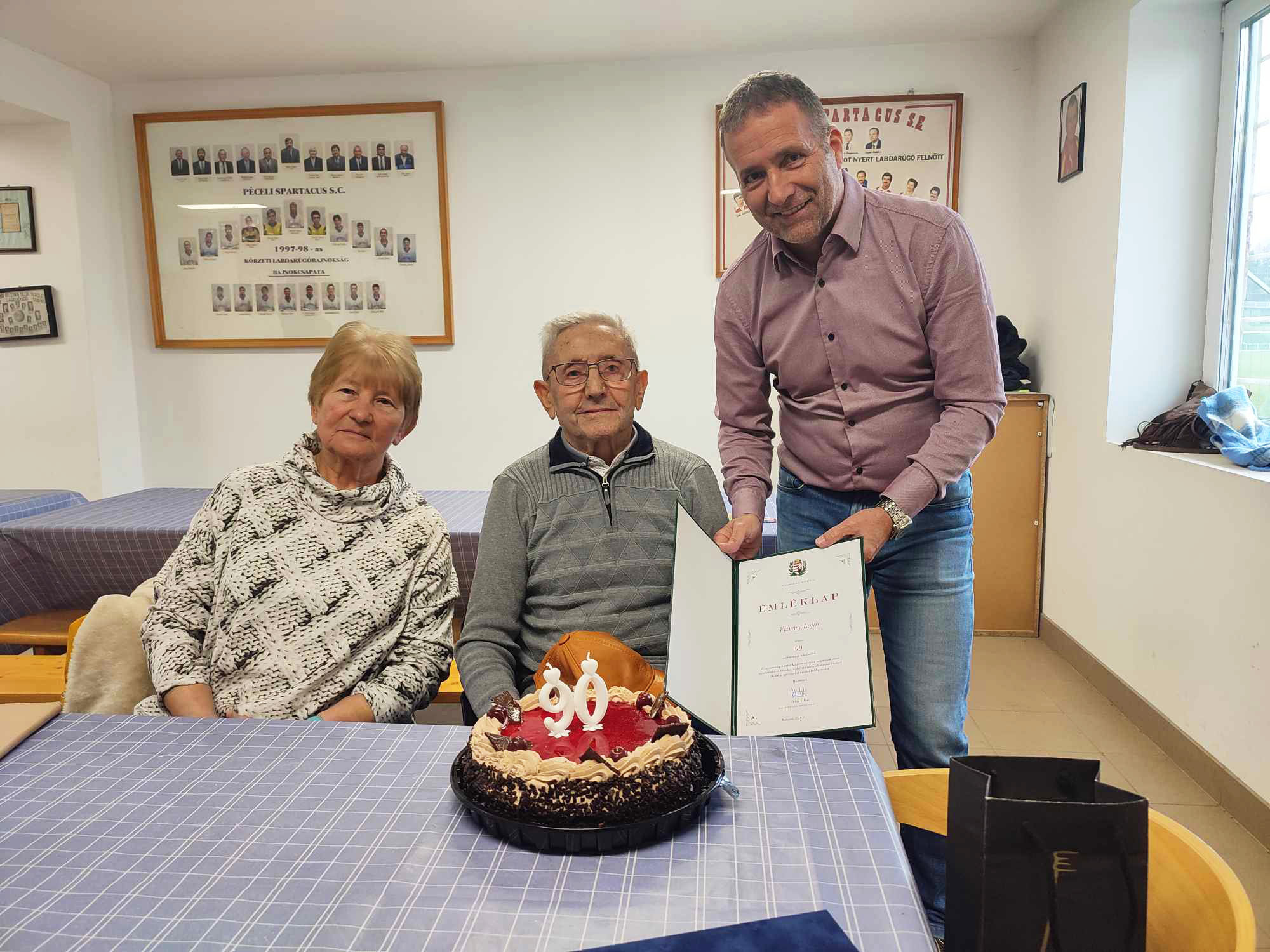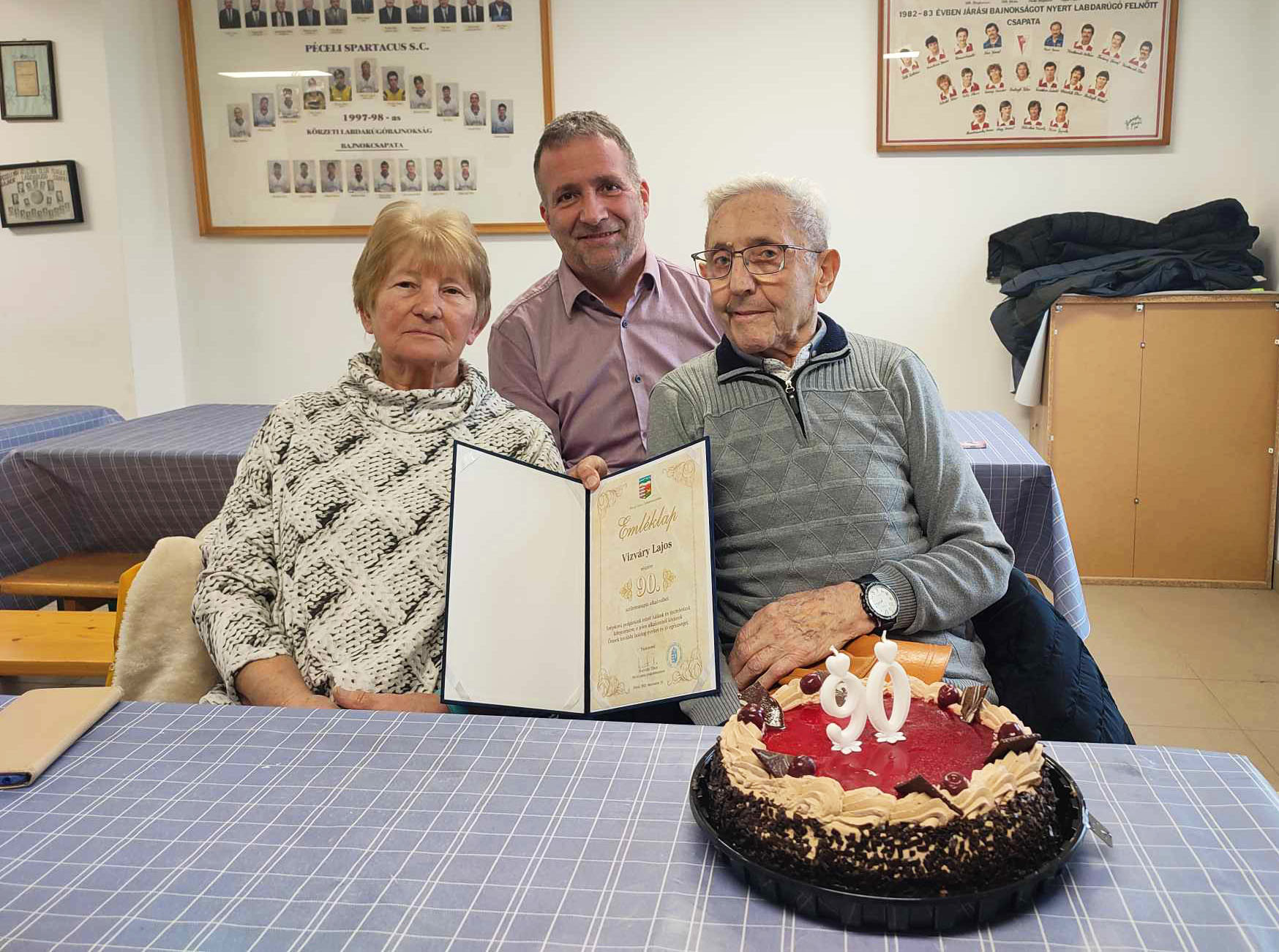 Horváth Tibor polgármester, Garamszegi Zsolt képviselő, a Péceli Spartacus SE alelnöke, Kristóf Péter képviselő, a Spartacus felnőtt csapatának vezetőedzője, a felnőtt játékosok és az öregfiúk játékosai 90. születésnapja alkalmából köszöntötték Vízváry Lajost, a Spartacus SE tősgyökeres tagját.