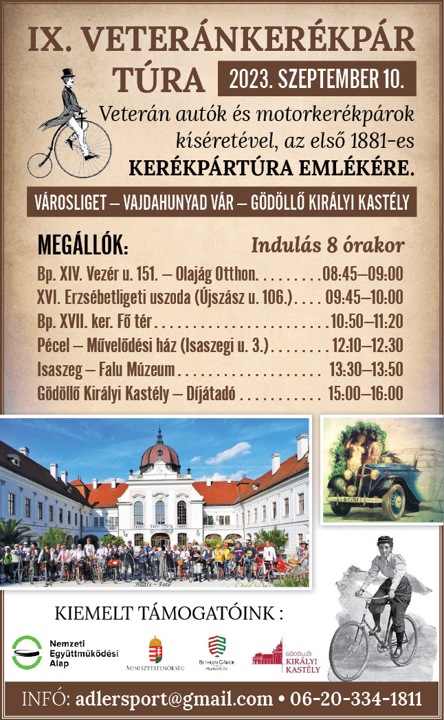 Az Adler Sport Club szeptember 10-én újra megrendezi az immár hagyományossá vált veterán kerékpártúrát Gödöllőre, a Királyi Kastélyba.
