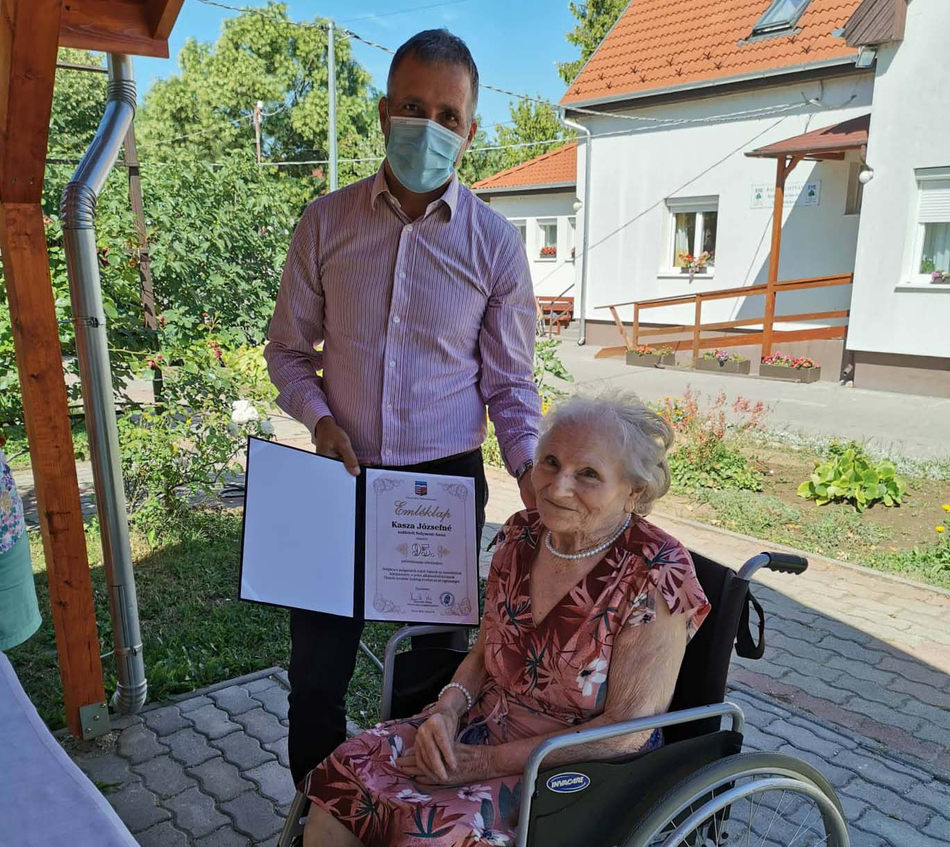 Kasza Józsefnét, Anikó nénit 95. születésnapja alkalmából Horváth Tibor polgármester köszöntötte az ESE Baczoni István Rehabilitációs és Ápoló Otthonában.