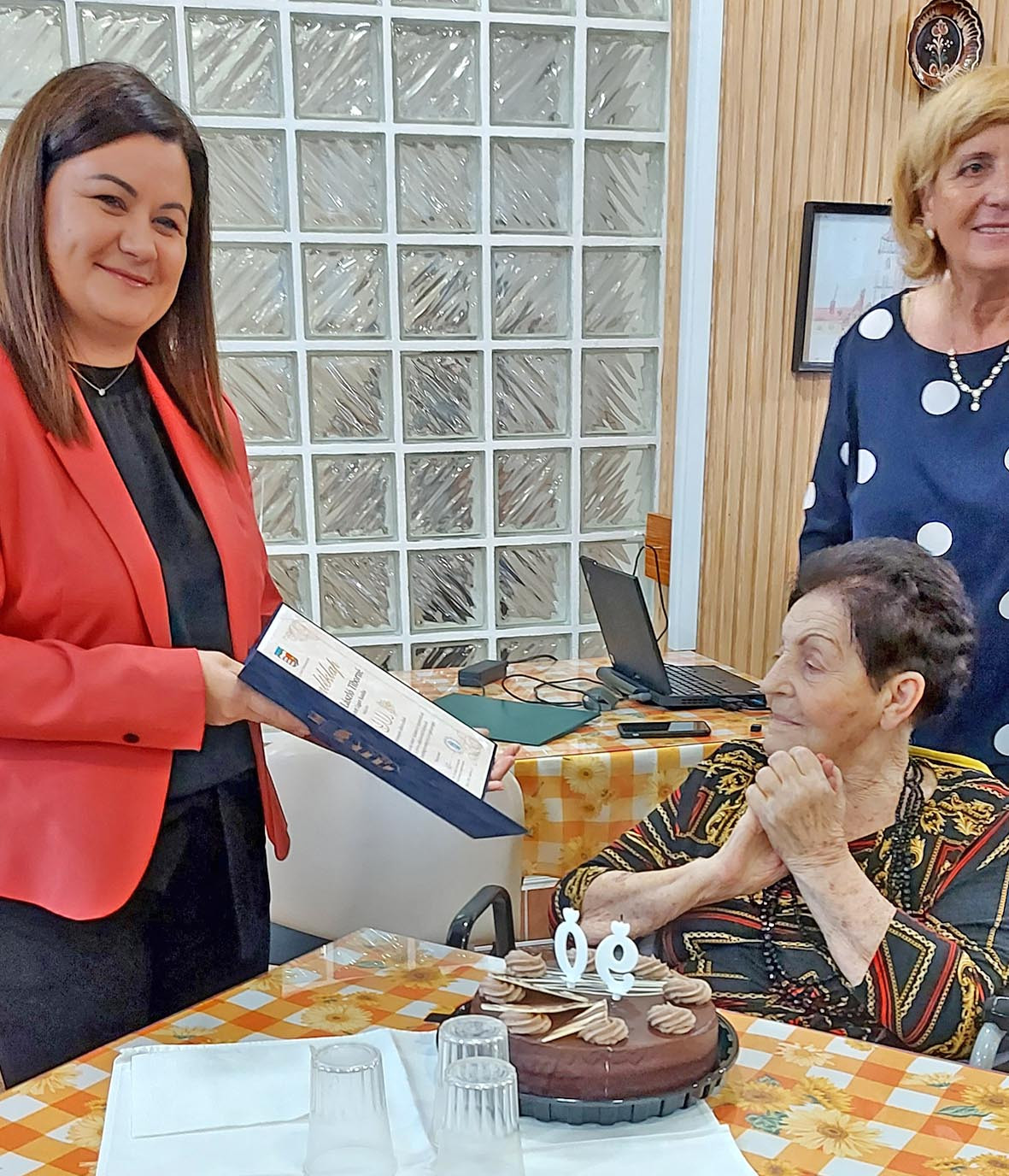 Sólyom László Tibornét dr. Kővári Alexandra polgármester, Perger Krisztina alpolgármester és Zsadányi János Zsolt képviselő köszöntötte virággal és tortával a Jézus Szíve Társasága Idősek Otthonában.