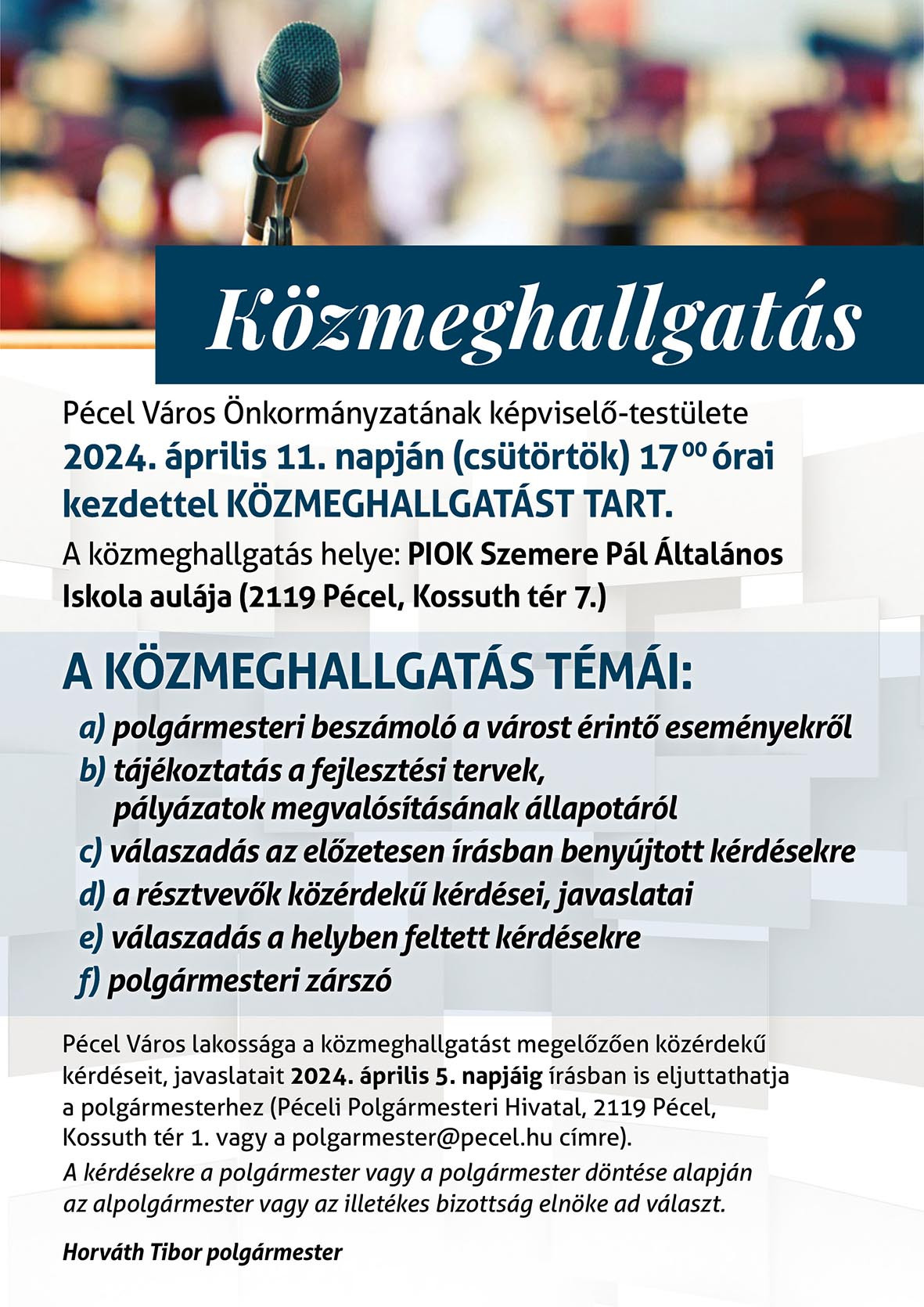 Kezdőlap Hírek Önkormányzat Közmeghallgatás 2024 március 04. Közmeghallgatás 2024. április 11. (csütörtök) 17 óra Közmeghallgatás és lakossági fórum tájékoztatás.pdf