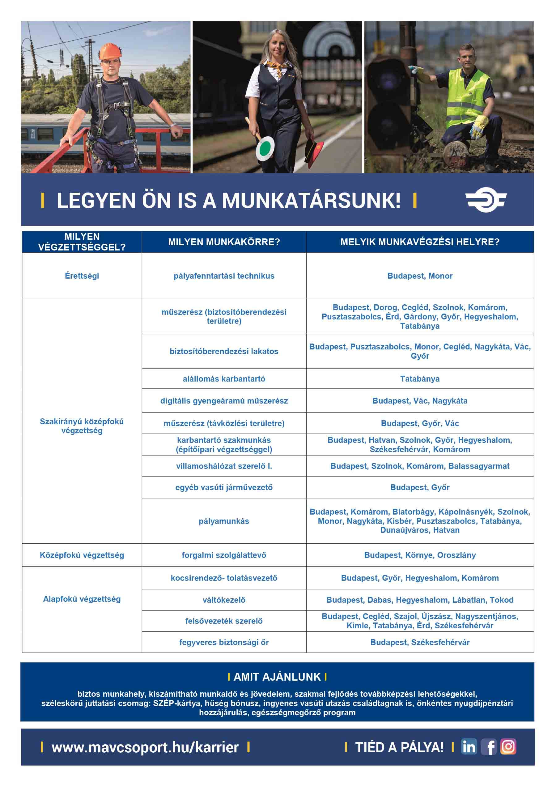 Kezdőlap Hírek Közösség Legyen ön is a munkatársunk! 2020 szeptember 04. Legyen ön is a munkatársunk! Az üres pozíciók betöltése érdekében a MÁV Zrt. minden lehetőséget meg kíván ragadni, hogy elérje a jelenleg munkával nem rendelkezőket és megismertesse velük a szakmai lehetőségeket.
