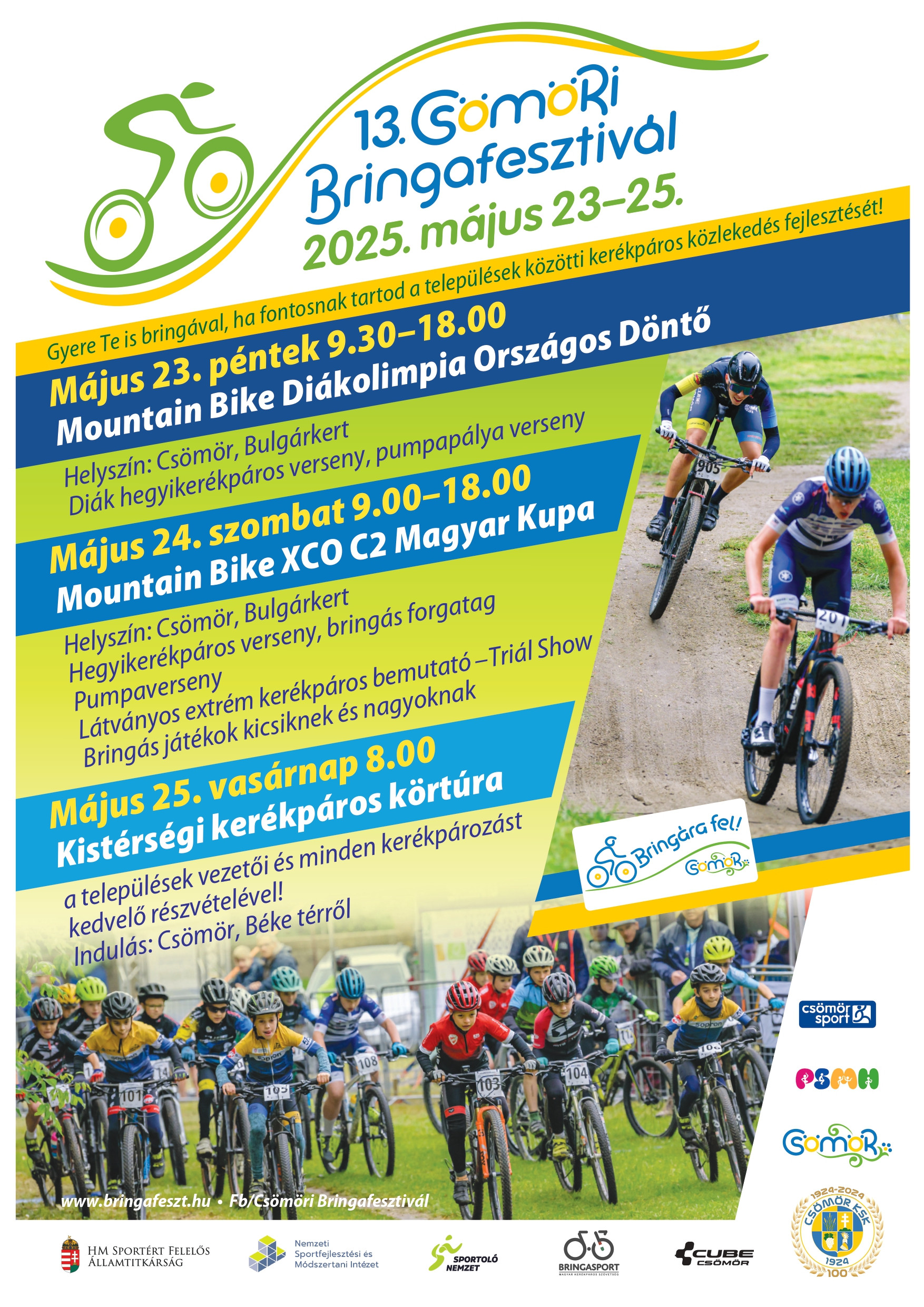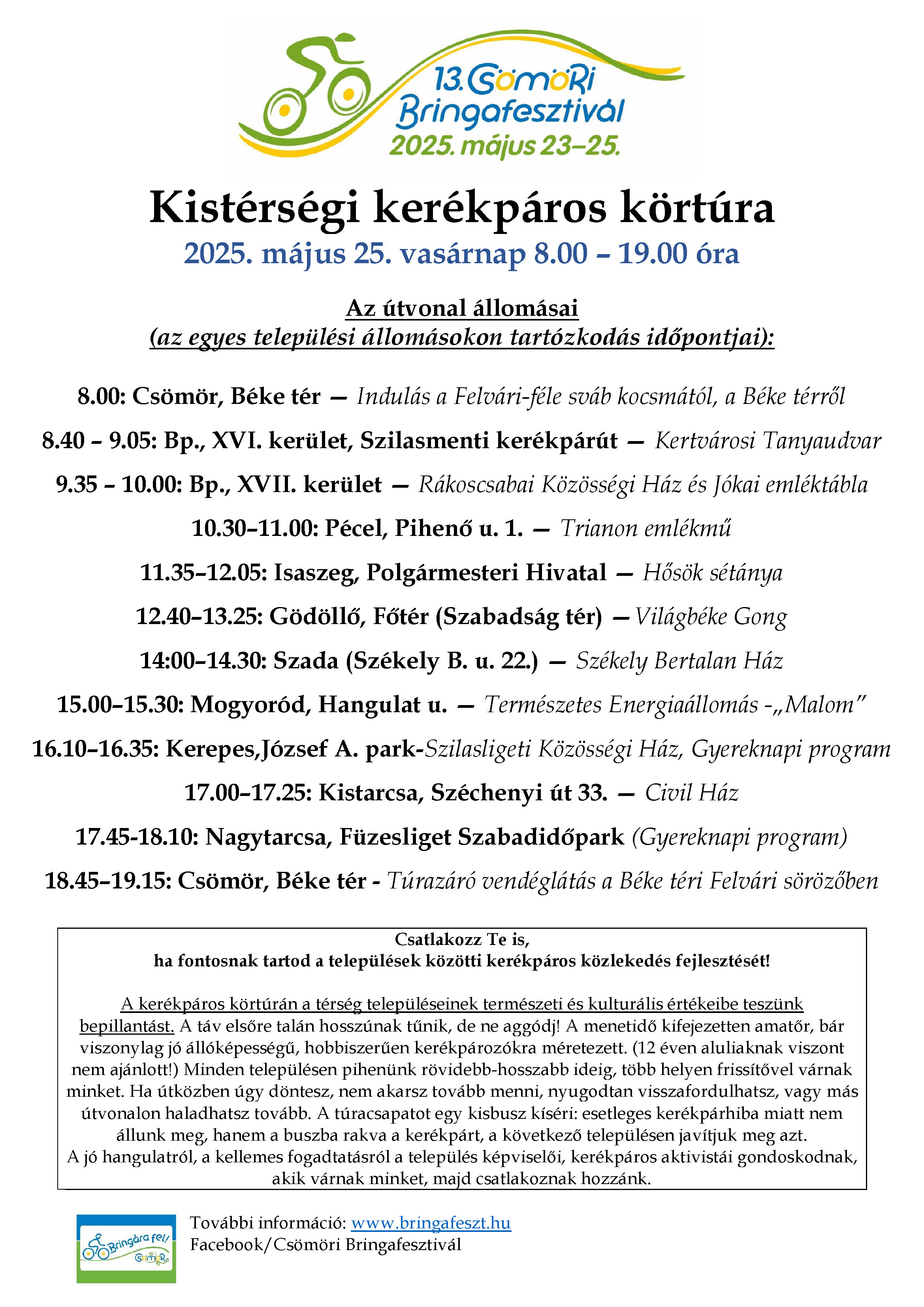 Május 23-25. között ismét megrendezik a Csömöri Bringafesztivált Csömörön és a térségben. Az egész hétvégét lefedő program keretében május 25-én (vasárnap) a Kistérségi kerékpáros körtúra útvonala Pécelt is érinti. A rendezvény kimondott célja a környező települések kulturális és természeti értékeinek bemutatása és megismertetése. A bringásokat Pécelen a Millenniumi Nemzeti Emlékparkban fogadjuk 10:30 óra körül, ahonnan Isaszeg irányába indulnak majd tovább.