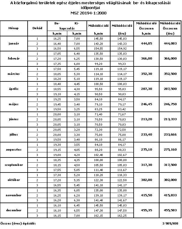 A közvilágítás ki- és bekapcsolása egy tapasztalati úton meghatározott, a napkeltéhez és a napnyugtához igazodó, az NKM Áramhálózati Kft. elosztói Üzletszabályzatában rögzített közvilágítási naptár szerint történik, melyet a Magyar Energetikai és Közmű-szabályozási Hivatal hagy jóvá.