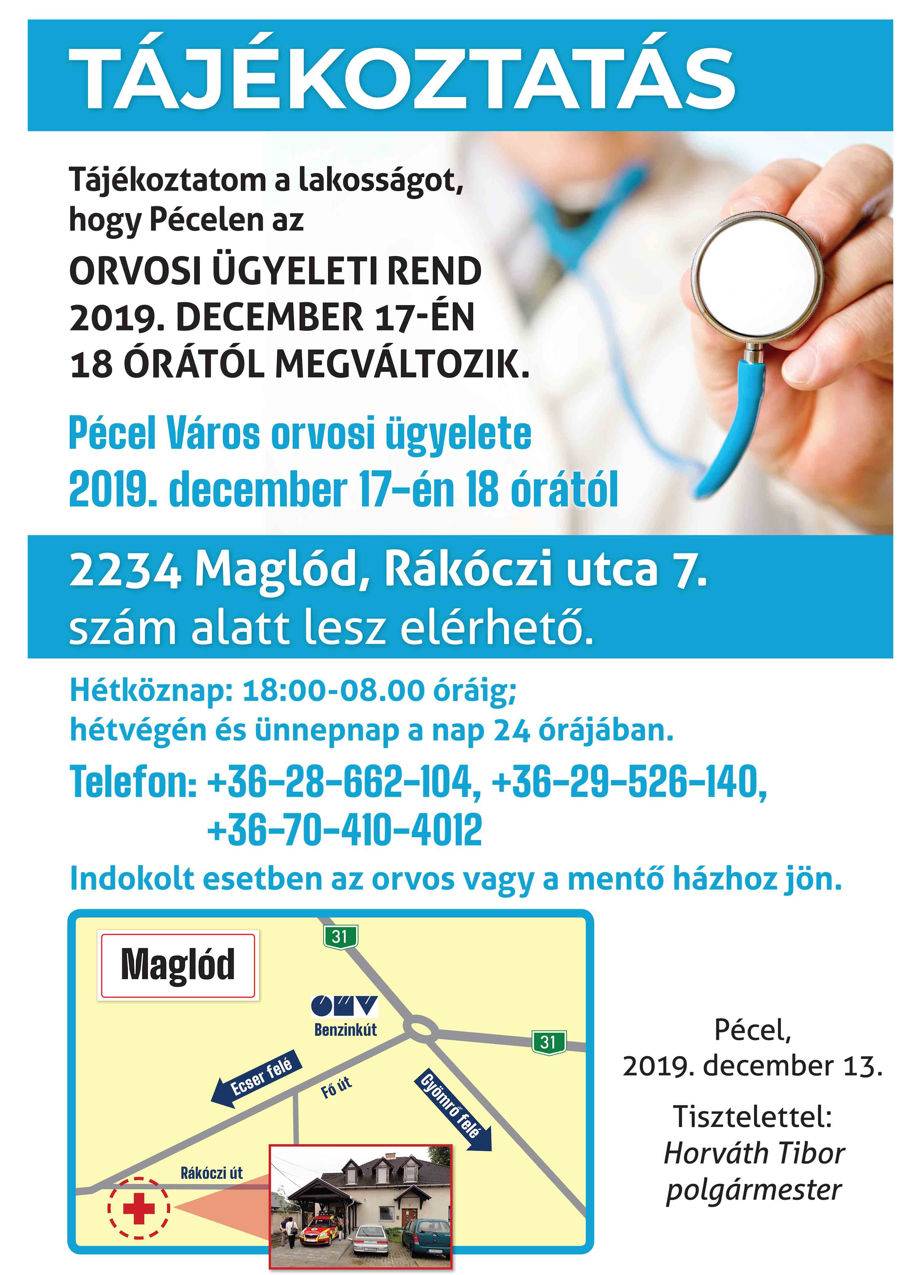 A háziorvosi ügyeletről szóló decemberi tájékoztató azt az információt tartalmazta, hogy Pécel város orvosi ügyelete 2019. december 17-től 2020. január 2-ig Maglódon lesz elérhető. Ez az időpont már elmúlt, az ügyelet viszont még mindig Maglódon működik.