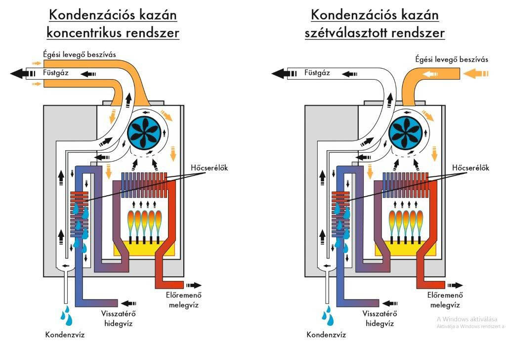 Végül egy modern, zárt égésterű, kondenzációs fűtőkészülék, kétféle égési levegő bevezetés és füstgáz elvezetés kialakítással:
