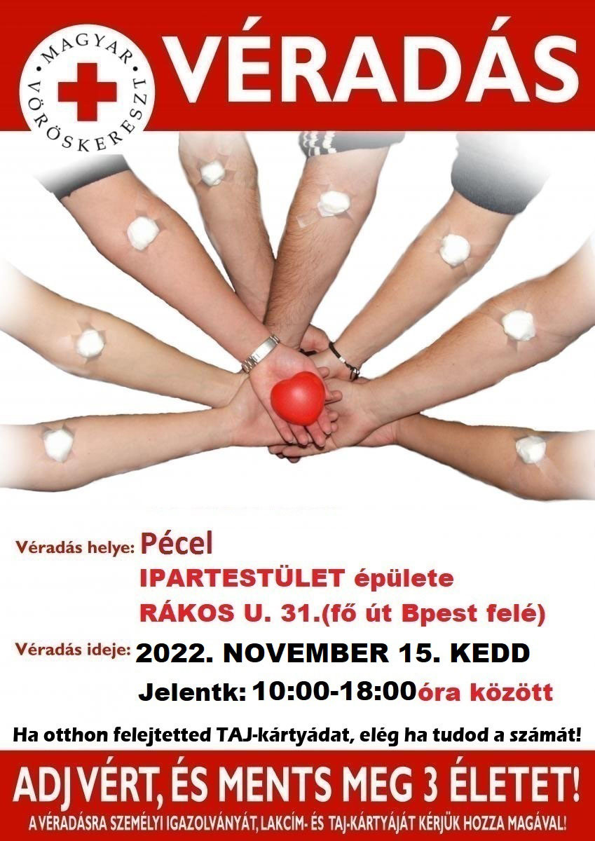 Kezdőlap Hírek Közösség Véradás 2022 november 07. Véradás 2022. november 15. (kedd) 10 órától 18 óráig - Péceli Ipartestület székháza (Rákos utca 31.)