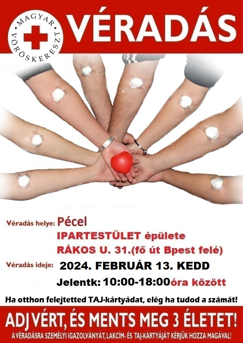 Kezdőlap Hírek Közösség Véradás - 2024. február 13. (kedd) 10 órától 18 óráig - Péceli Ipartestület székháza (Rákos utca 31.) 2024 február 05. Véradás - 2024. február 13. (kedd) 10 órától 18 óráig - Péceli Ipartestület székháza (Rákos utca 31.)