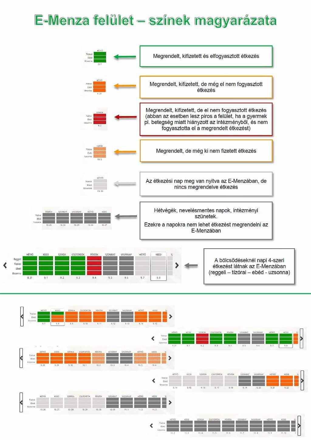 FELHÍVJUK A FIGYELMET, hogy a szolgáltató az E-Menzában regisztrált és megrendelt étkezések adagszámát veszi figyelembe és a megrendelés alapján szállítja ki az ételt. Amennyiben az étkezés megrendelése nem történik meg, úgy az intézményekben nem biztosított a gyermek ellátása!